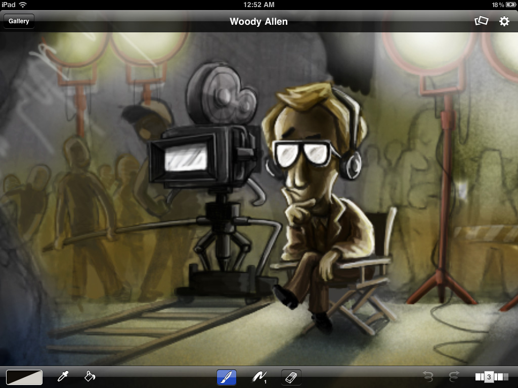 The above illustration of Woody Allen directing (who else but) Woody Allen is the first portrait in the series. There's a lot to say about it compositionally, but I'll leave most of the discussion for when I've got the whole set completed (the idea is that the series will ultimately form something of a narrative of the artist in New York throughout the eras).